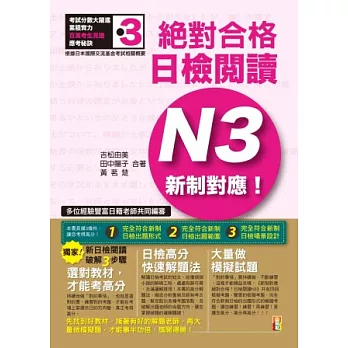 第3? 完全符合新制日檢的出題範圍博客來書店2.日檢高分解題法。解讀日檢考試的短文,就像偵探小說的解碼工程,處處有跡可尋、充滿邏輯推理!《新制對應 絕對合格!日檢閱讀N3》的高分解題法,徹底分析舊制及新制考古題,幫您點出各種考題落點,及破解出題老師的命題方向,讓您掌握破題的邏輯關鍵,馬上掌握高分技巧!3.大量做模擬試題。「對的事情」要持續做,不斷練習,這樣才能精益求精。《新制對應 絕對合格!日檢閱讀N3》共有四回模擬考題。豐富的模擬考題,完全符合新制日檢的出題形式的模擬考題,讓您練習!練習!再練習!更讓您高分、高分再高分!!!先找到好好教材,接著有好的解題老師,再大量做模擬題,才能事半功倍,旗開得勝!作者簡介博客來吉松由美日本東京都人。慶應大學日文系碩士。從事日語教學及日語教科書編寫多年。並於各日本雜誌的專欄執筆。專業作者。田中陽子日本駒澤大學法學博士課程畢。日本駒澤大學法學部助教講師、武藏女子大學副教授。專心致力於編寫日語教材及日語教學多年。黃茗楚畢業於東吳大學日文系、東吳大學日文研究所碩士班